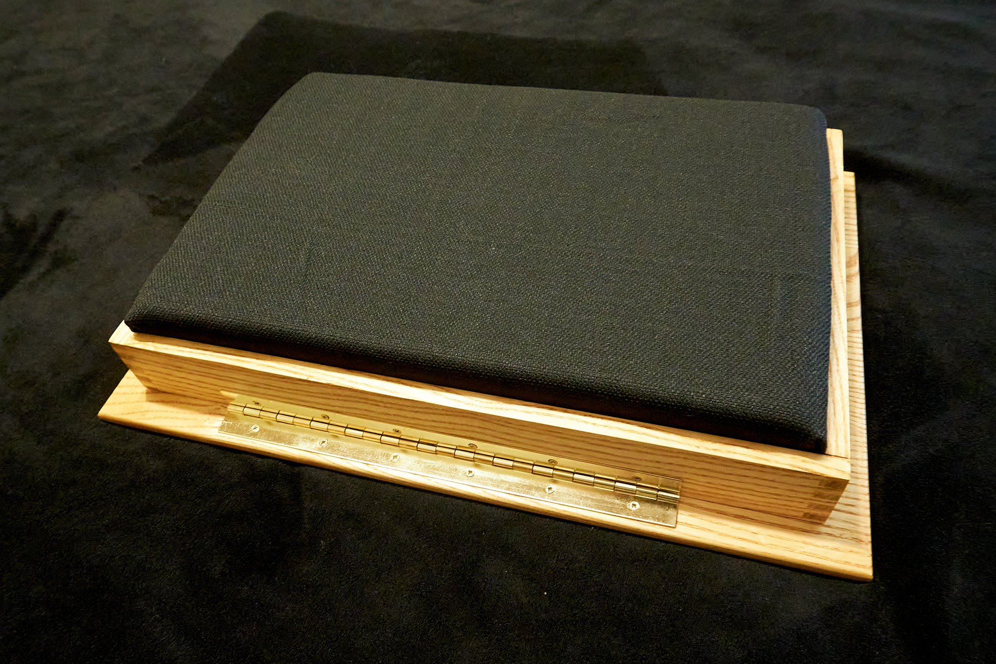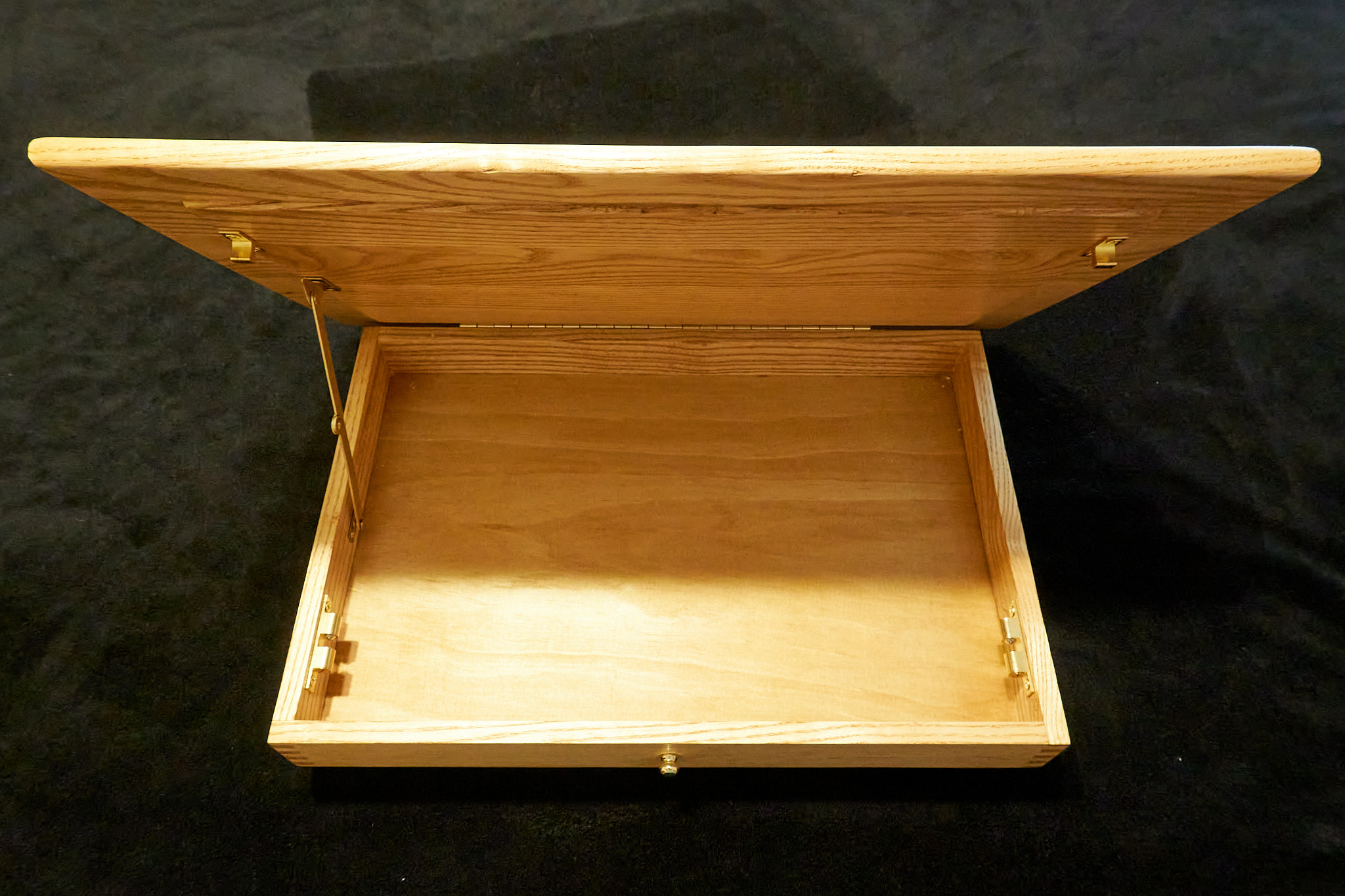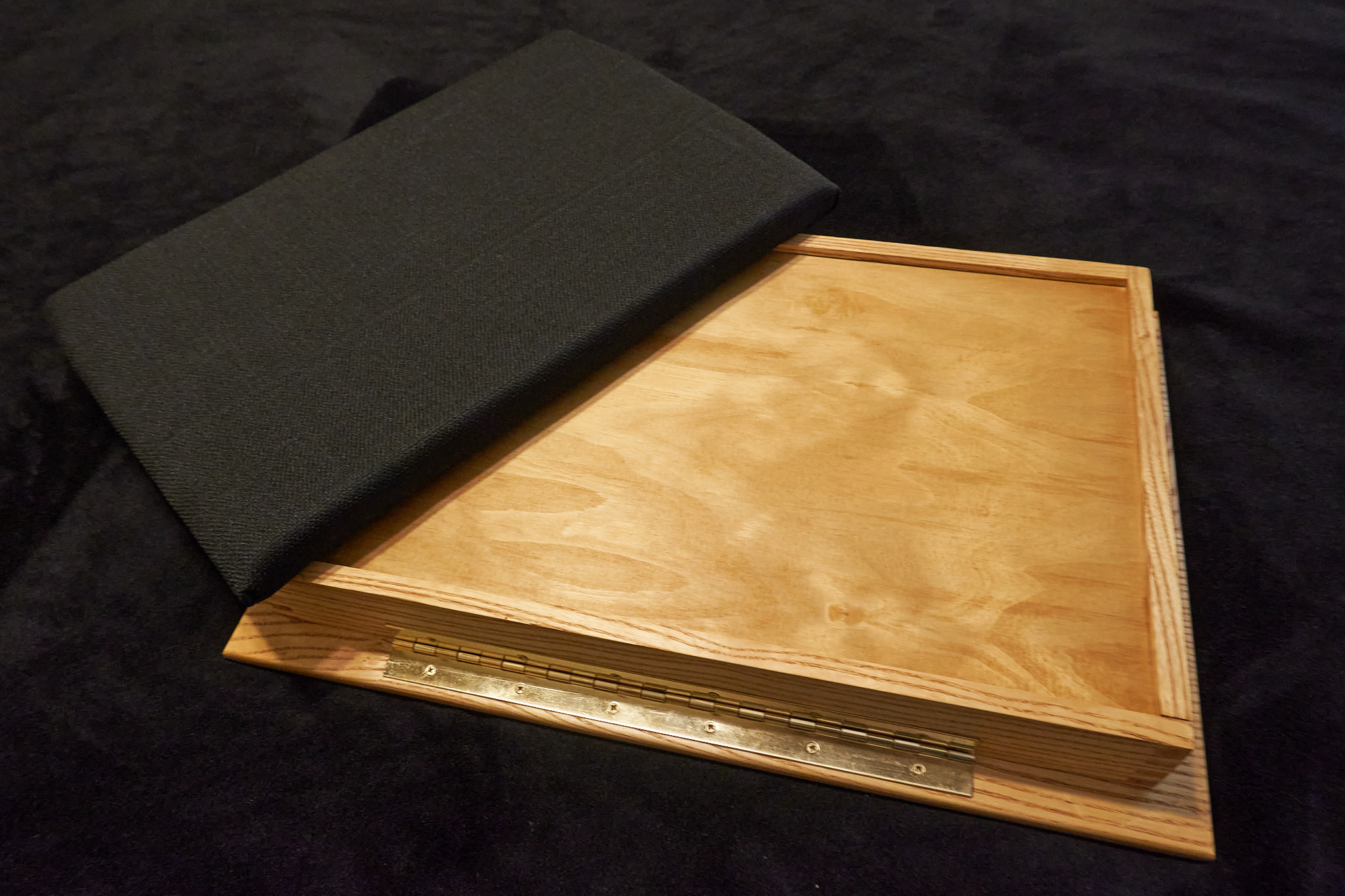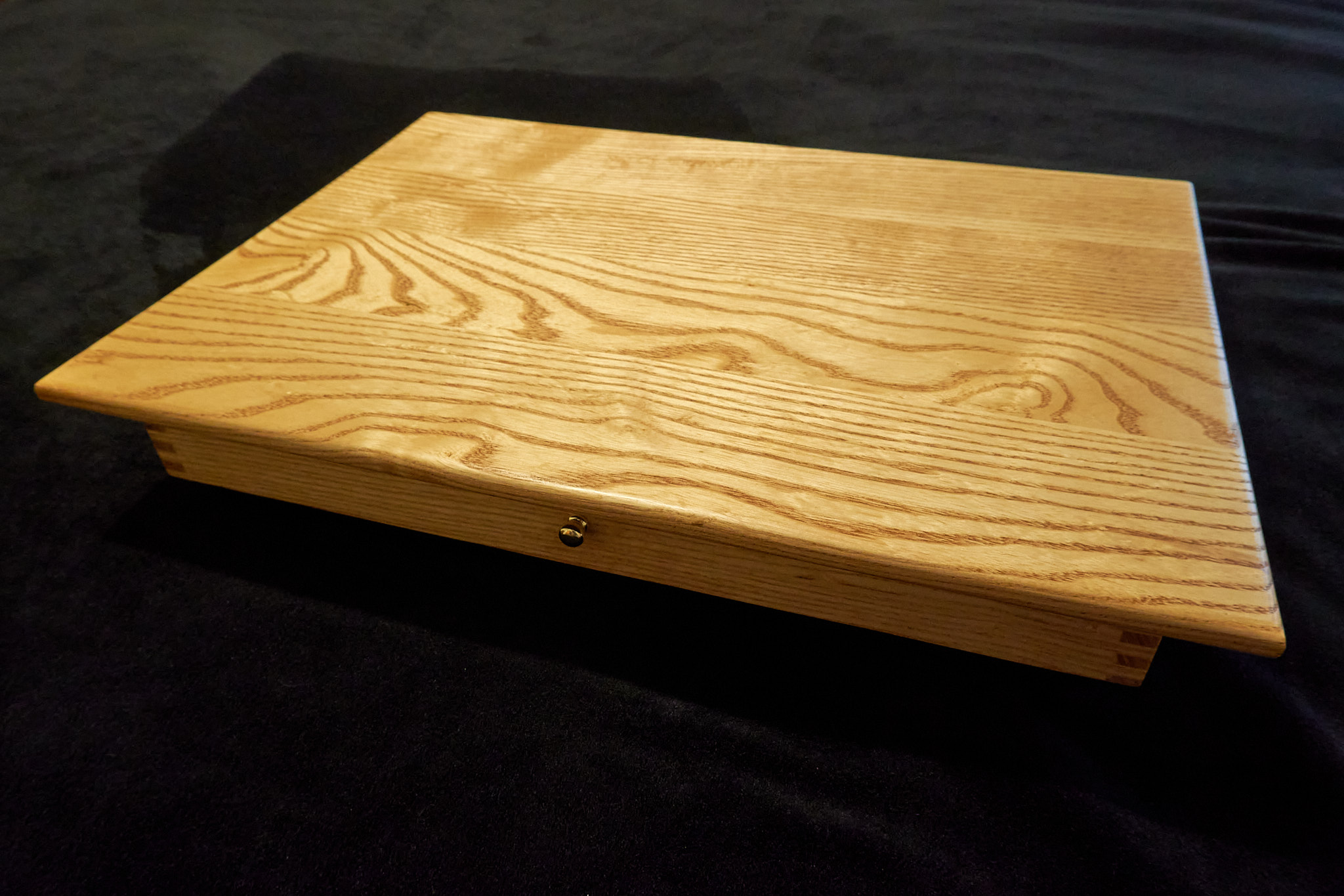 A lap desk in ash wood with a birch plywood bottom. Brass piano hinge, lid stay, and double-ball clasps. Removable foam bottom covered in thick black twill (ships unattached; heavy-duty hook-loop strip included). The top measures 18″ by 14″, and the interior is 1 5/8″ deep. Weighs about 8 1/2 pounds. Finished with satin urethane.